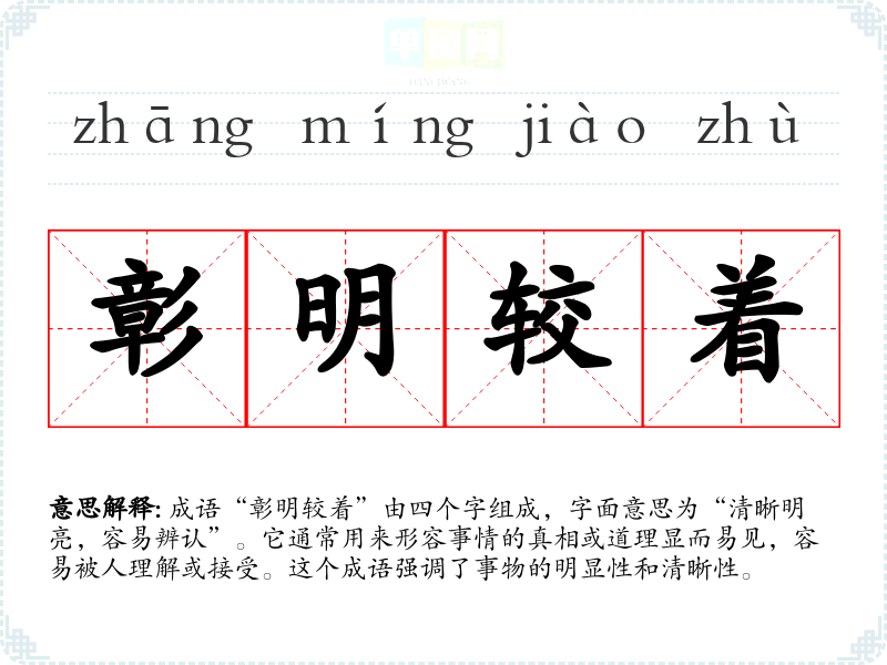 成语“彰明较着”由四个字组成,字面意思为“清晰明亮,容易辨认”。它通常用来形容事情的真相或道理显而易见,容易被人理解或接受。这个成语强调了事物的明显性和清晰性。