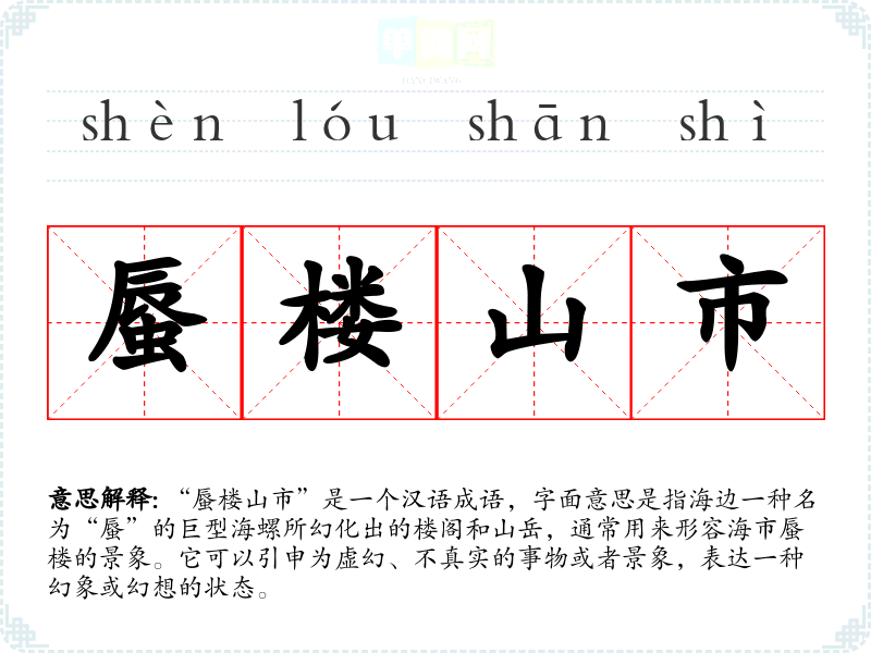 “蜃楼山市”是一个汉语成语,字面意思是指海边一种名为“蜃”的巨型海螺所幻化出的楼阁和山岳,通常用来形容海市蜃楼的景象。它可以引申为虚幻、不真实的事物或者景象,表达一种幻象或幻想的状态。