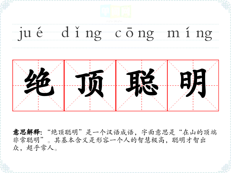 “绝顶聪明”的具体来源较少,但其构成可以追溯到古代文献中对聪明才智的描述。成语中的“绝顶”通常指的是顶峰、最高点,暗示在某一领域中达到了极致的状态,而“聪明”则指的是聪慧、智慧,合在一起便形成了对智慧极致的赞美。