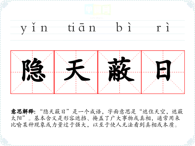 “隐天蔽日”是一个成语,字面意思是“遮住天空,遮蔽太阳”。基本含义是形容遮挡、掩盖了广大事物或真相,通常用来比喻某种现象或力量过于强大,以至于使人无法看到真相或本质。
