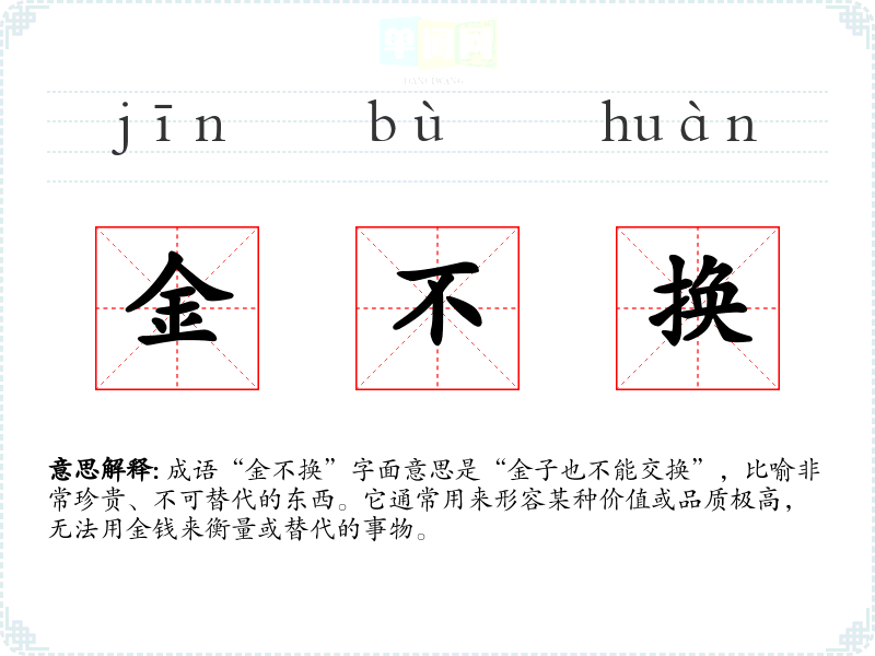 成语“金不换”字面意思是“金子也不能交换”,比喻非常珍贵、不可替代的东西。它通常用来形容某种价值或品质极高,无法用金钱来衡量或替代的事物。