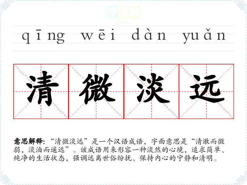 “清微淡远”是一个汉语成语,字面意思是“清澈而微弱,淡泊而遥远”。该成语用来形容一种淡然的心境,追求简单、纯净的生活状态,强调远离世俗纷扰、保持内心的宁静和清明。