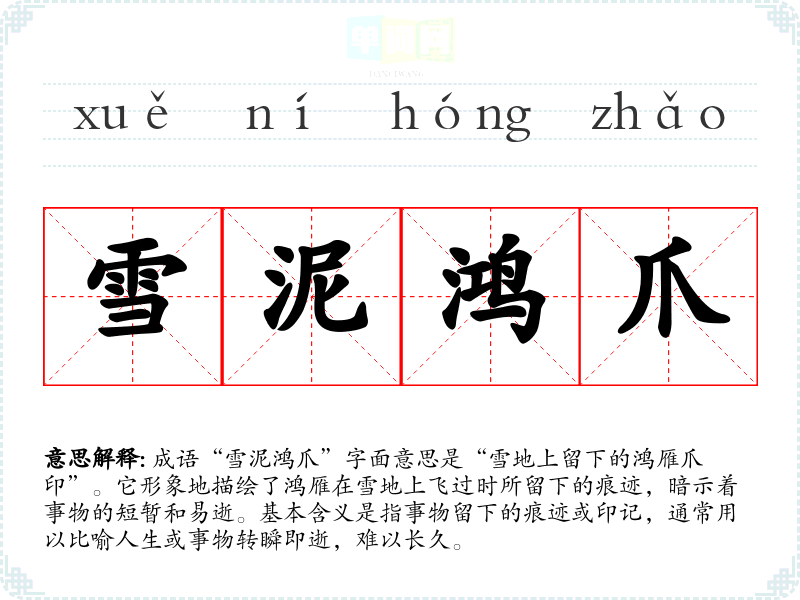 成语“雪泥鸿爪”字面意思是“雪地上留下的鸿雁爪印”。它形象地描绘了鸿雁在雪地上飞过时所留下的痕迹,暗示着事物的短暂和易逝。基本含义是指事物留下的痕迹或印记,通常用以比喻人生或事物转瞬即逝,难以长久。