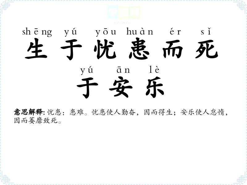 | 生于忧患而死于安乐 | 忧患:患难。忧患使人勤奋,因而得生;安乐使人怠惰,因而萎靡致死。 |