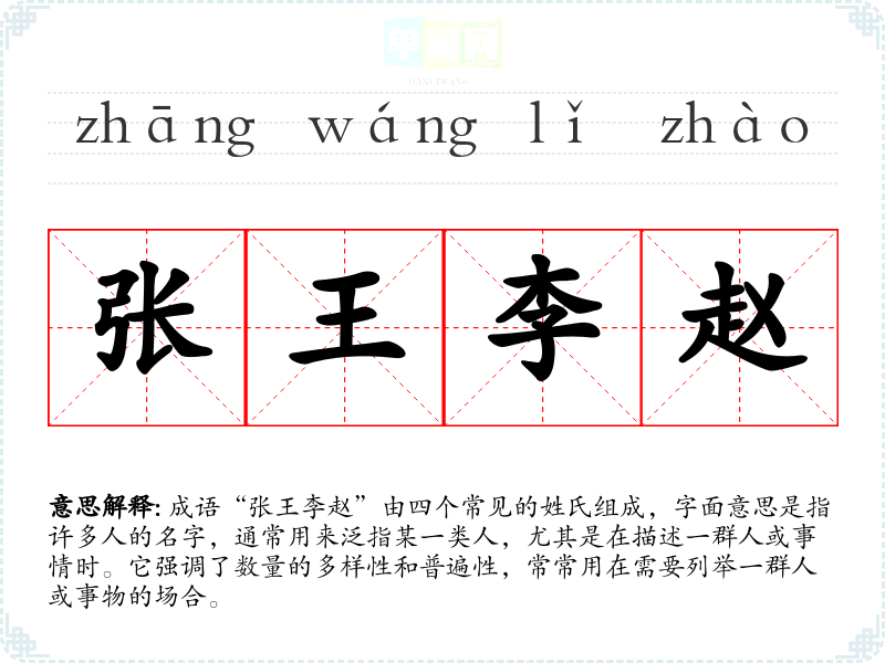 成语“张王李赵”由四个常见的姓氏组成,字面意思是指许多人的名字,通常用来泛指某一类人,尤其是在描述一群人或事情时。它强调了数量的多样性和普遍性,常常用在需要列举一群人或事物的场合。