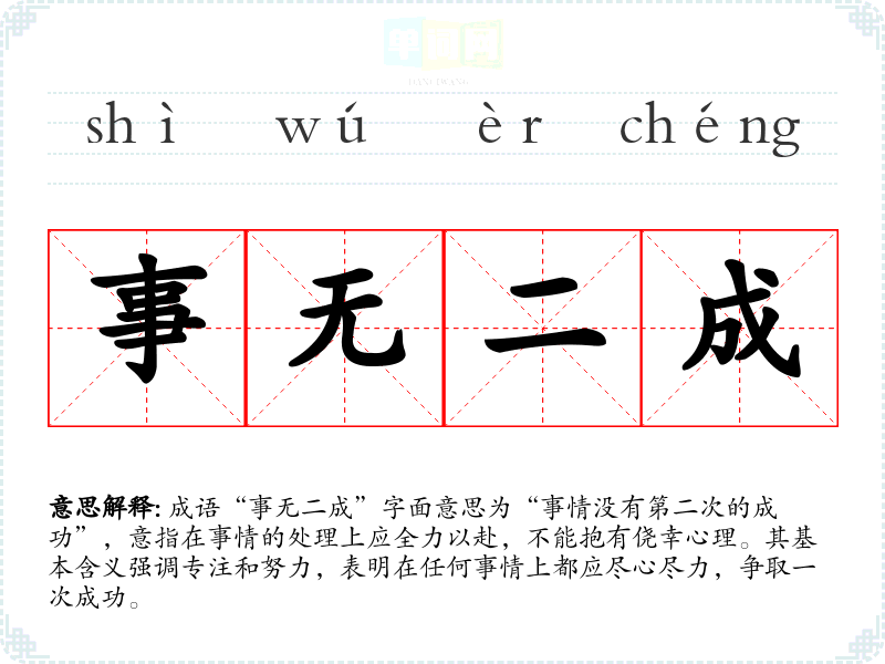 成语“事无二成”字面意思为“事情没有第二次的成功”,意指在事情的处理上应全力以赴,不能抱有侥幸心理。其基本含义强调专注和努力,表明在任何事情上都应尽心尽力,争取一次成功。