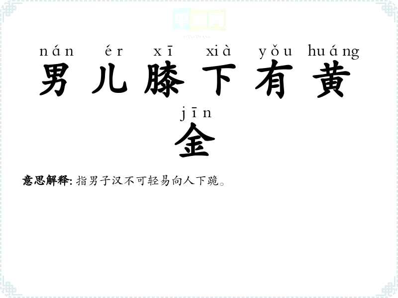 | 男儿膝下有黄金 | 指男子汉不可轻易向人下跪。 |