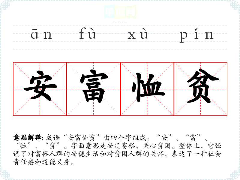 成语“安富恤贫”由四个字组成:“安”、“富”、“恤”、“贫”。字面意思是安定富裕,关心贫困。整体上,它强调了对富裕人群的安稳生活和对贫困人群的关怀,表达了一种社会责任感和道德义务。