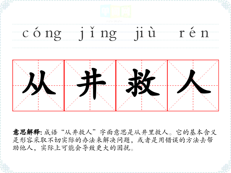 成语“从井救人”字面意思是从井里救人。它的基本含义是形容采取不切实际的办法来解决问题,或者是用错误的方法去帮助他人,实际上可能会导致更大的困扰。