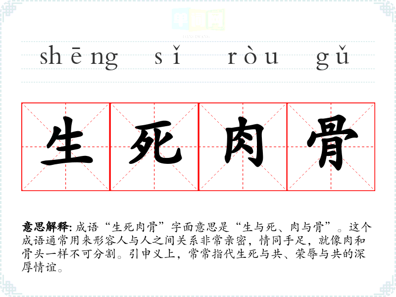 成语“生死肉骨”字面意思是“生与死、肉与骨”。这个成语通常用来形容人与人之间关系非常亲密,情同手足,就像肉和骨头一样不可分割。引申义上,常常指代生死与共、荣辱与共的深厚情谊。