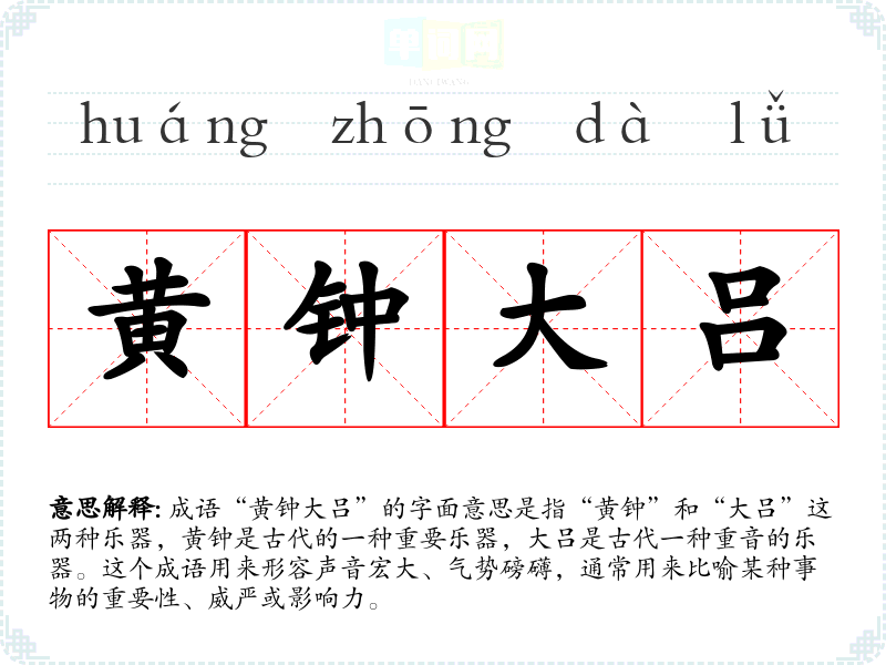 成语“黄钟大吕”的字面意思是指“黄钟”和“大吕”这两种乐器,黄钟是古代的一种重要乐器,大吕是古代一种重音的乐器。这个成语用来形容声音宏大、气势磅礴,通常用来比喻某种事物的重要性、威严或影响力。
