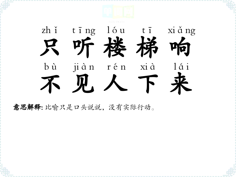 | 只听楼梯响,不见人下来 | 比喻只是口头说说,没有实际行动。 |