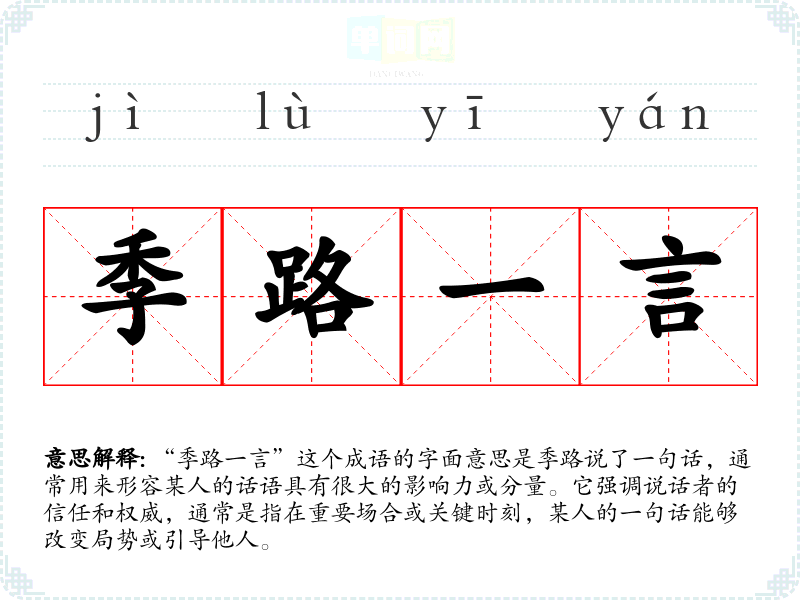“季路一言”这个成语的字面意思是季路说了一句话,通常用来形容某人的话语具有很大的影响力或分量。它强调说话者的信任和权威,通常是指在重要场合或关键时刻,某人的一句话能够改变局势或引导他人。