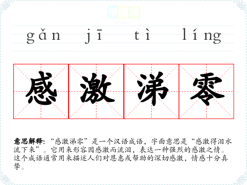 “感激涕零”的成语来源于古代文人对于感恩和情感表达的重视。虽然没有确切的出处,但可以追溯到古代文学作品中关于感激与泪水的描写。类似的表达在唐诗、宋词中多有出现,反映了古人对情感的细腻观察和描述。