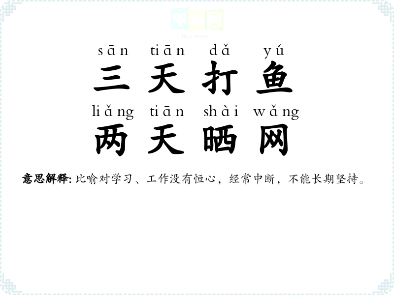 | 三日打鱼,两日晒网 | 比喻对学习、工作没有恒心,经常中断,不能长期坚持。 |