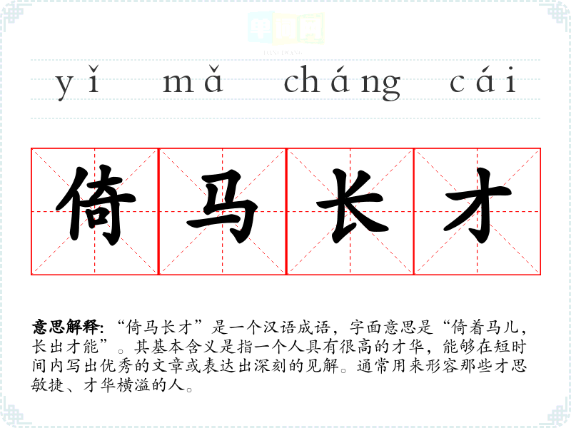 “倚马长才”出自于《后汉书·王允传》,其中讲述了王允的才华横溢,能在骑马的时候迅速写出文章。这个成语反映了古代文人对才华的追求和赞美,尤其是在紧急情况下依然能够展现出卓越才能的能力。