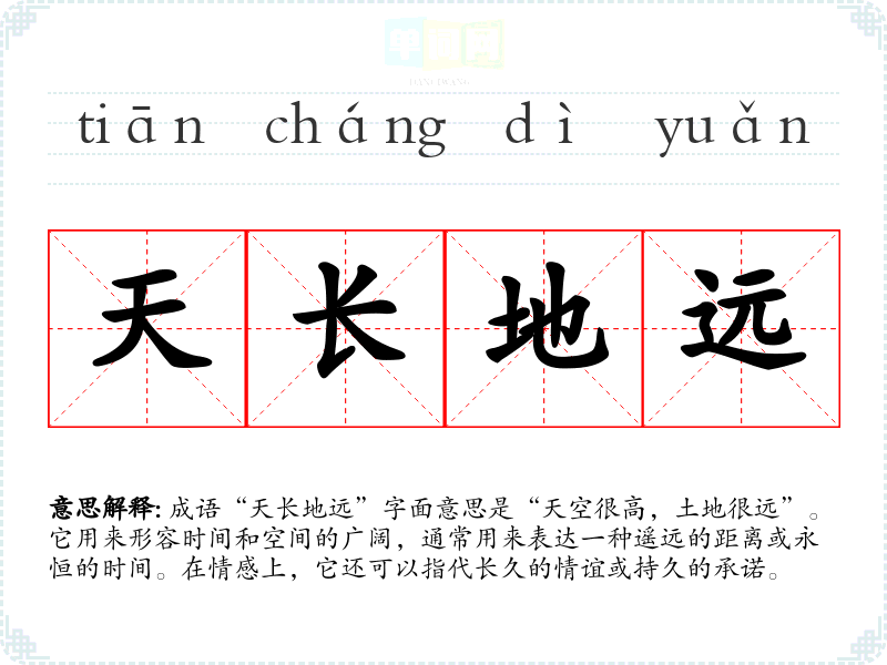 成语“天长地远”字面意思是“天空很高,土地很远”。它用来形容时间和空间的广阔,通常用来表达一种遥远的距离或永恒的时间。在情感上,它还可以指代长久的情谊或持久的承诺。