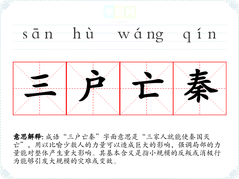 成语“三户亡秦”字面意思是“三家人就能使秦国灭亡”,用以比喻少数人的力量可以造成巨大的影响,强调局部的力量能对整体产生重大影响。其基本含义是指小规模的反叛或消极行为能够引发***的灾难或变故。