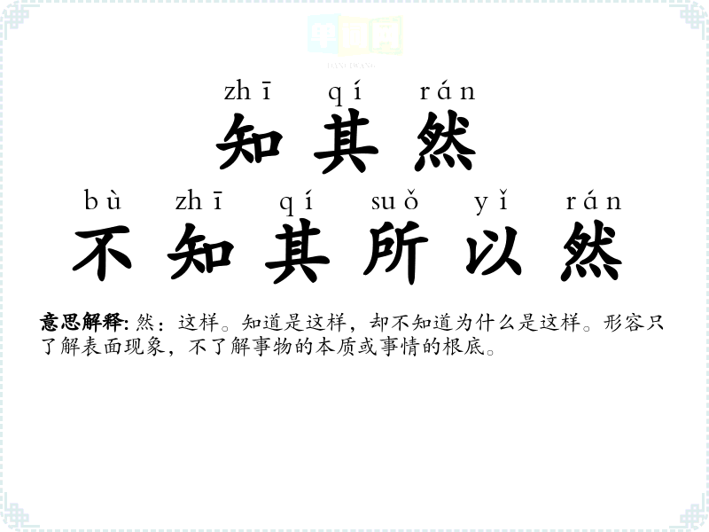 | 不知其所以然 | 不知它究竟如何会这样的。指不了解事物的本质或事情的根底。 |
