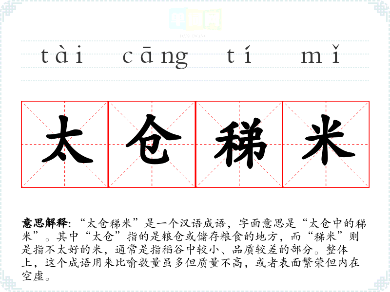 “太仓稊米”是一个汉语成语,字面意思是“太仓中的稊米”。其中“太仓”指的是粮仓或储存粮食的地方,而“稊米”则是指不太好的米,通常是指稻谷中较小、品质较差的部分。整体上,这个成语用来比喻数量虽多但质量不高,或者表面繁荣但内在空虚。