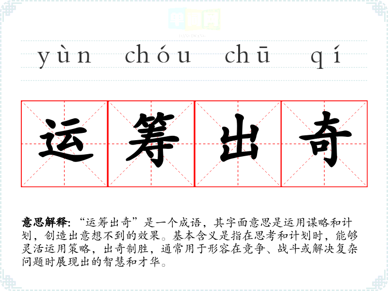 “运筹出奇”是一个成语,其字面意思是运用谋略和计划,创造出意想不到的效果。基本含义是指在思考和计划时,能够灵活运用策略,出奇制胜,通常用于形容在竞争、战斗或解决复杂问题时展现出的智慧和才华。