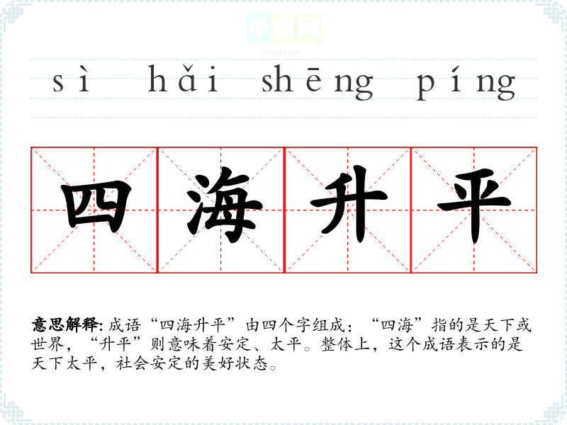 成语“四海升平”由四个字组成:“四海”指的是天下或世界,“升平”则意味着安定、太平。整体上,这个成语表示的是天下太平,社会安定的美好状态。