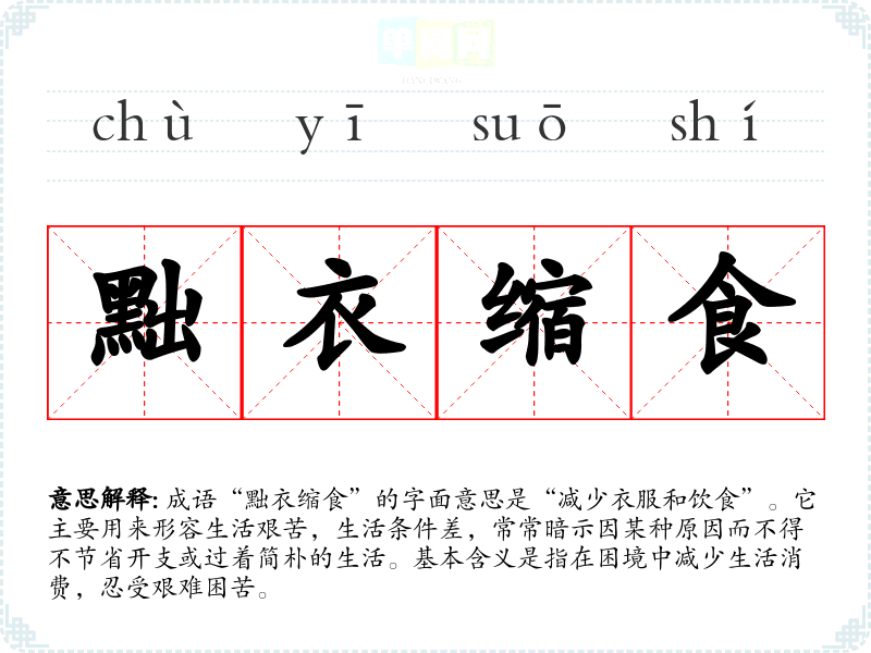 成语“黜衣缩食”的字面意思是“减少衣服和饮食”。它主要用来形容生活艰苦,生活条件差,常常暗示因某种原因而不得不节省开支或过着简朴的生活。基本含义是指在困境中减少生活消费,忍受艰难困苦。