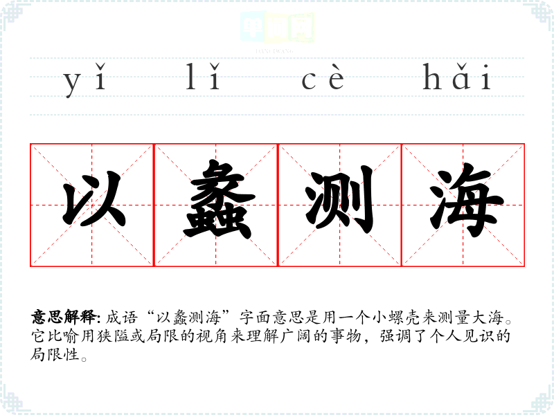 | 持蠡测海 | 蠡:瓠瓢,古代舀水用具。指用瓢来测量海水的深浅多少。比喻用浅薄的眼光去看待高深的事物。 |