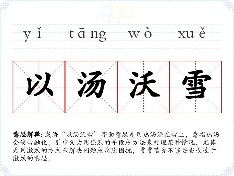 成语“以汤沃雪”字面意思是用热汤浇在雪上,意指热汤会使雪融化。引申义为用强烈的手段或方法来处理某种情况,尤其是用激烈的方式来解决问题或消除困扰,常常暗含不够妥当或过于激烈的意思。