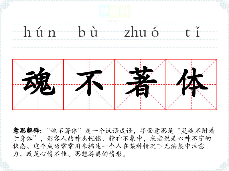 “魂不著体”是一个汉语成语,字面意思是“灵魂不附着于身体”,形容人的神志恍惚、精神不集中,或者说是心神不宁的状态。这个成语常常用来描述一个人在某种情况下无法集中注意力,或是心情不佳、思想游离的情形。