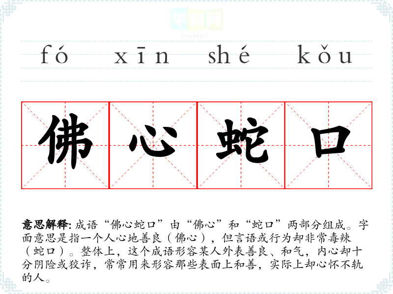 成语“佛心蛇口”由“佛心”和“蛇口”两部分组成。字面意思是指一个人心地善良(佛心),但言语或行为却非常毒辣(蛇口)。整体上,这个成语形容某人外表善良、和气,内心却十分阴险或狡诈,常常用来形容那些表面上和善,实际上却心怀不轨的人。