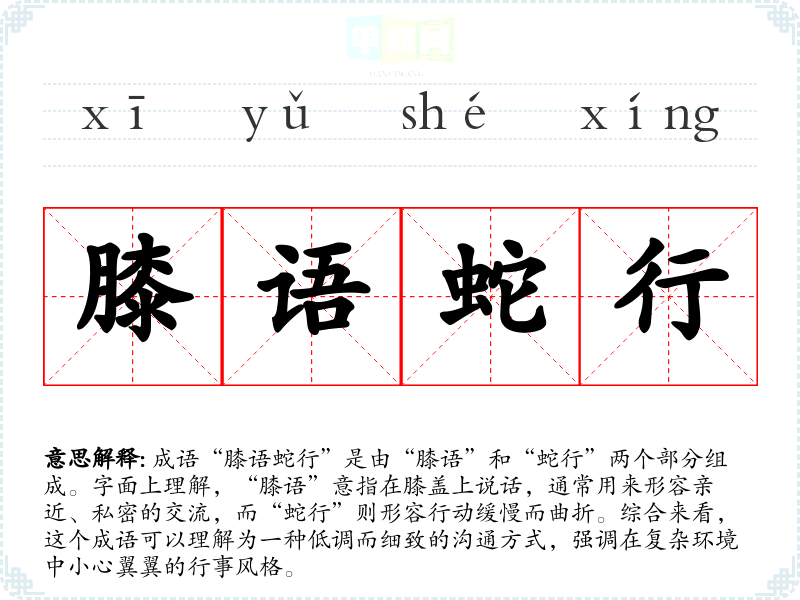 成语“膝语蛇行”是由“膝语”和“蛇行”两个部分组成。字面上理解,“膝语”意指在膝盖上说话,通常用来形容亲近、私密的交流,而“蛇行”则形容行动缓慢而曲折。综合来看,这个成语可以理解为一种低调而细致的沟通方式,强调在复杂环境中小心翼翼的行事风格。
