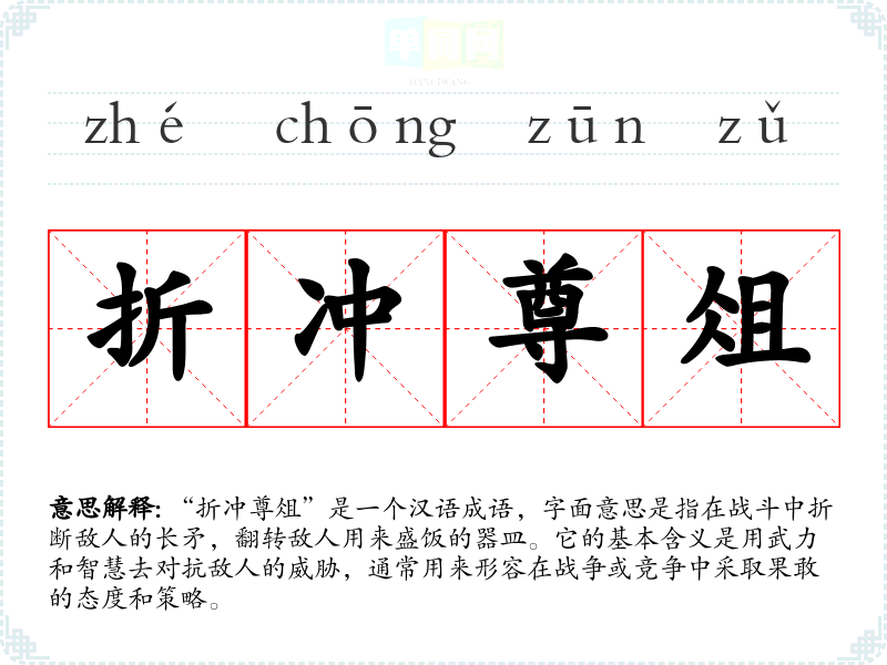 “折冲尊俎”是一个汉语成语,字面意思是指在战斗中折断敌人的长矛,翻转敌人用来盛饭的器皿。它的基本含义是用武力和智慧去对抗敌人的威胁,通常用来形容在战争或竞争中采取果敢的态度和策略。