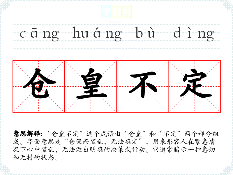 “仓皇不定”这个成语由“仓皇”和“不定”两个部分组成。字面意思是“仓促而慌乱,无法确定”,用来形容人在紧急情况下心中慌乱,无法做出明确的决策或行动。它通常暗示一种急切和无措的状态。