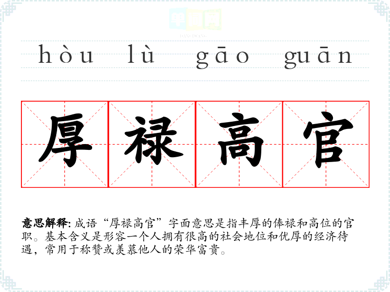 成语“厚禄高官”字面意思是指丰厚的俸禄和高位的官职。基本含义是形容一个人拥有很高的社会地位和优厚的经济待遇,常用于称赞或羡慕他人的荣华富贵。