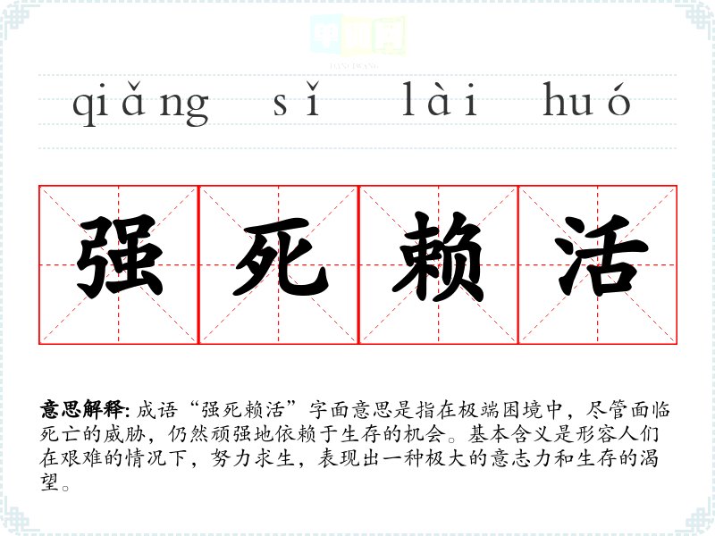 成语“强死赖活”字面意思是指在极端困境中,尽管面临死亡的威胁,仍然顽强地依赖于生存的机会。基本含义是形容人们在艰难的情况下,努力求生,表现出一种极大的意志力和生存的渴望。