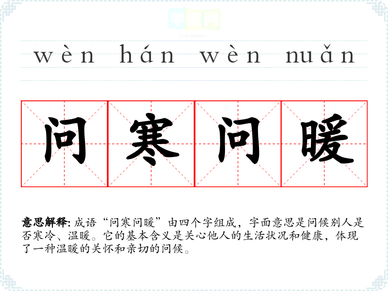 成语“问寒问暖”由四个字组成,字面意思是问候别人是否寒冷、温暖。它的基本含义是关心他人的生活状况和健康,体现了一种温暖的关怀和亲切的问候。