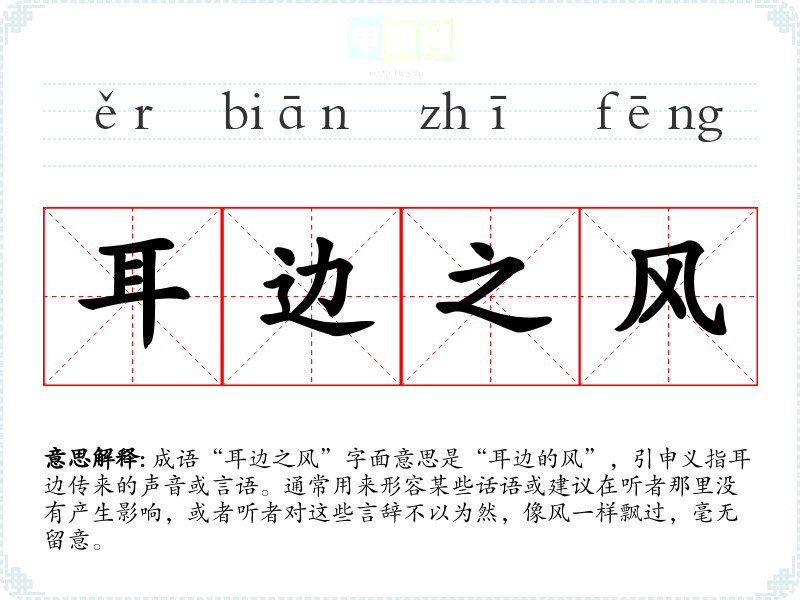成语“耳边之风”字面意思是“耳边的风”,引申义指耳边传来的声音或言语。通常用来形容某些话语或建议在听者那里没有产生影响,或者听者对这些言辞不以为然,像风一样飘过,毫无留意。