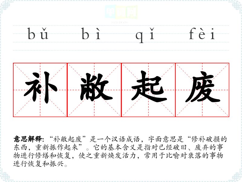 | 补敝起废 | 补:修整;敝:破旧;起:起用;废:废弃。修整破旧的东西,起用废弃的东西。比喻恢复旧的制度。 |