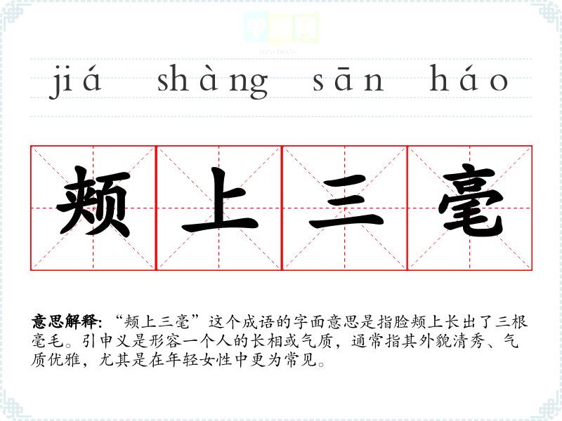 “颊上三毫”这个成语的字面意思是指脸颊上长出了三根毫毛。引申义是形容一个人的长相或气质,通常指其外貌清秀、气质优雅,尤其是在年轻女性中更为常见。