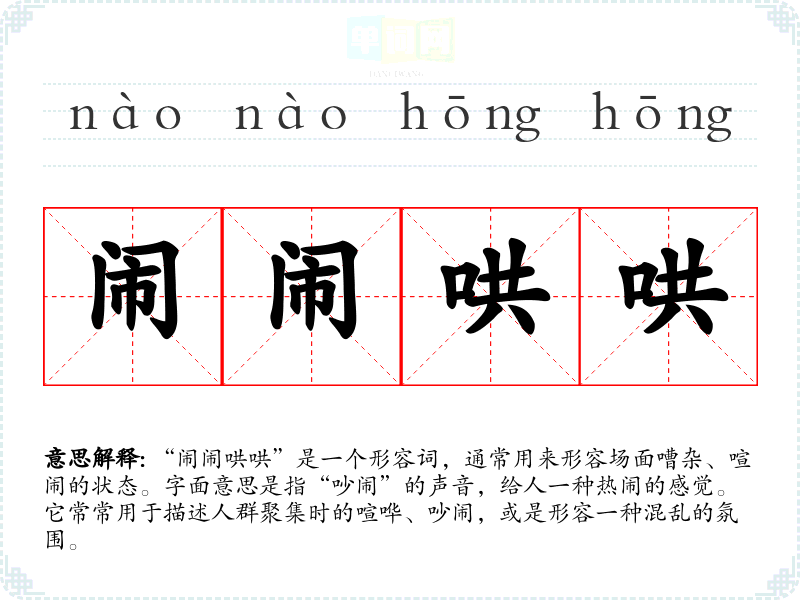 “闹闹哄哄”是一个形容词,通常用来形容场面嘈杂、喧闹的状态。字面意思是指“吵闹”的声音,给人一种热闹的感觉。它常常用于描述人群聚集时的喧哗、吵闹,或是形容一种混乱的氛围。