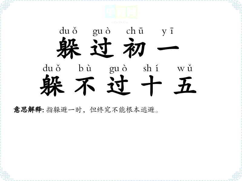| 躲过初一,躲不过十五 | 指躲避一时,但终究不能根本逃避。 |