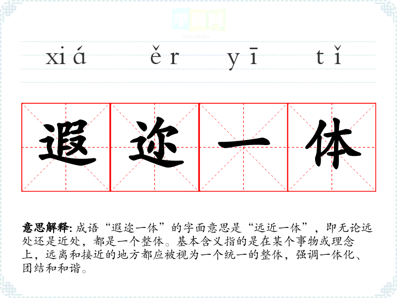 成语“遐迩一体”的字面意思是“远近一体”,即无论远处还是近处,都是一个整体。基本含义指的是在某个事物或理念上,远离和接近的地方都应被视为一个统一的整体,强调一体化、团结和和谐。