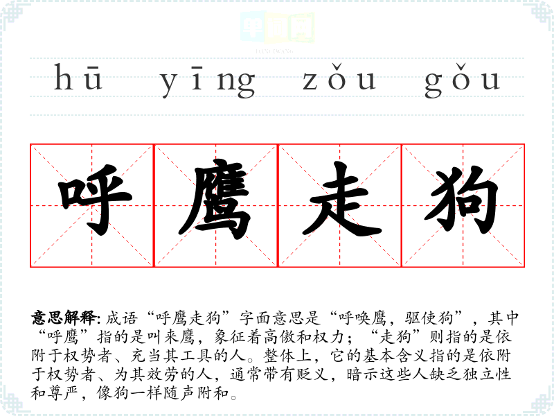 成语“呼鹰走狗”字面意思是“呼唤鹰,驱使狗”,其中“呼鹰”指的是叫来鹰,象征着高傲和权力;“走狗”则指的是依附于权势者、充当其工具的人。整体上,它的基本含义指的是依附于权势者、为其效劳的人,通常带有贬义,暗示这些人缺乏独立性和尊严,像狗一样随声附和。
