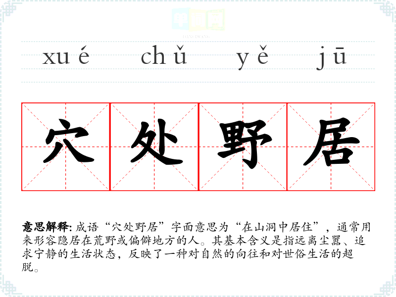 成语“穴处野居”字面意思为“在山洞中居住”,通常用来形容隐居在荒野或偏僻地方的人。其基本含义是指远离尘嚣、追求宁静的生活状态,反映了一种对自然的向往和对世俗生活的超脱。