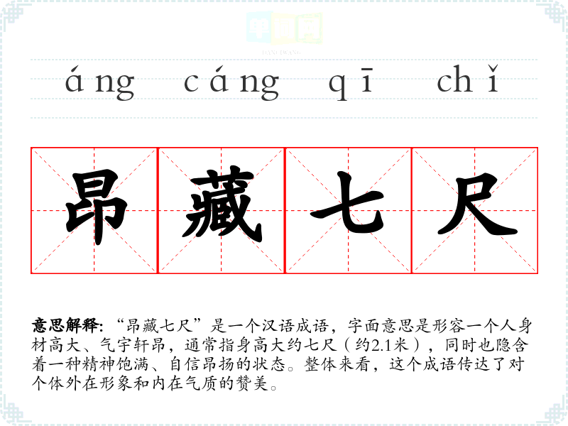 “昂藏七尺”是一个汉语成语,字面意思是形容一个人身材高大、气宇轩昂,通常指身高大约七尺(约2.1米),同时也隐含着一种精神饱满、自信昂扬的状态。整体来看,这个成语传达了对个体外在形象和内在气质的赞美。