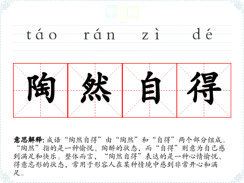 成语“陶然自得”由“陶然”和“自得”两个部分组成。“陶然”指的是一种愉悦、陶醉的状态,而“自得”则意为自己感到满足和快乐。整体而言,“陶然自得”表达的是一种心情愉悦、得意忘形的状态,常用于形容人在某种情境中感到非常开心和满足。