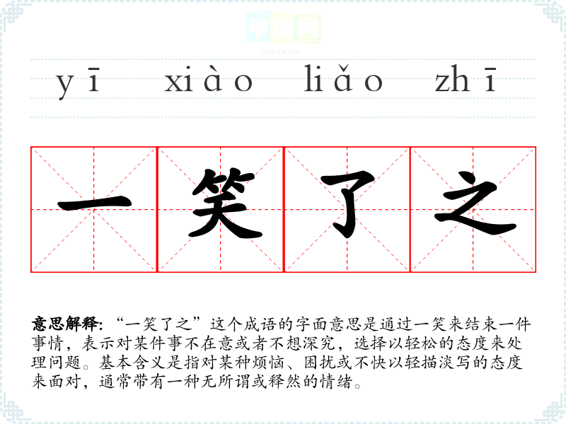 “一笑了之”这个成语的字面意思是通过一笑来结束一件事情,表示对某件事不在意或者不想深究,选择以轻松的态度来处理问题。基本含义是指对某种烦恼、困扰或不快以轻描淡写的态度来面对,通常带有一种无所谓或释然的情绪。