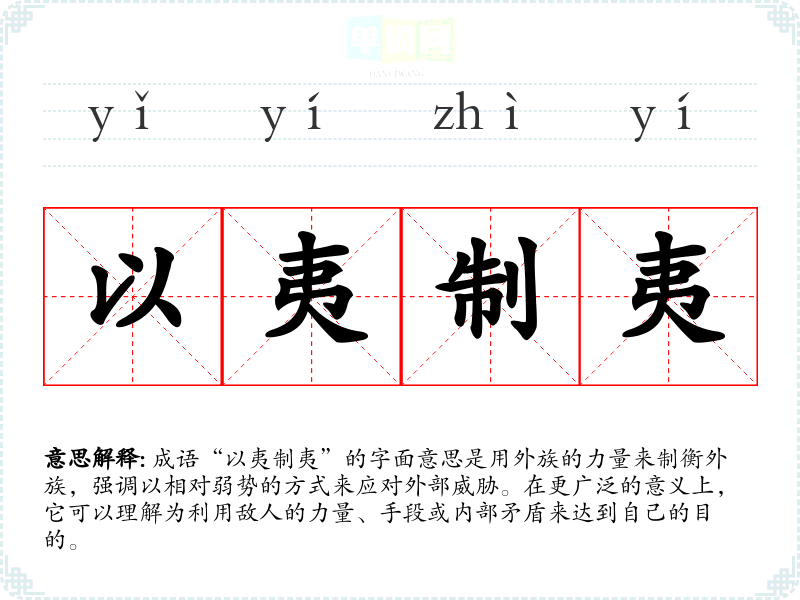 成语“以夷制夷”的字面意思是用外族的力量来制衡外族,强调以相对弱势的方式来应对外部威胁。在更广泛的意义上,它可以理解为利用敌人的力量、手段或内部矛盾来达到自己的目的。