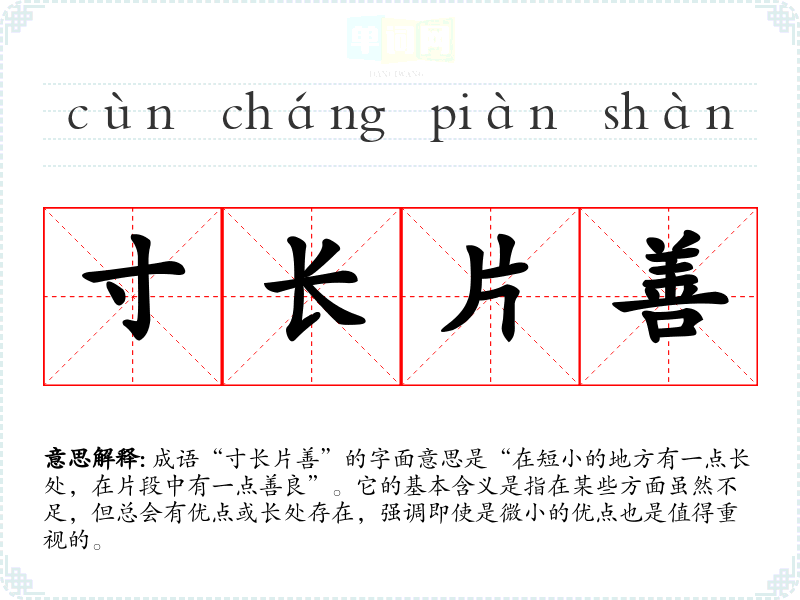 成语“寸长片善”的字面意思是“在短小的地方有一点长处,在片段中有一点善良”。它的基本含义是指在某些方面虽然不足,但总会有优点或长处存在,强调即使是微小的优点也是值得重视的。